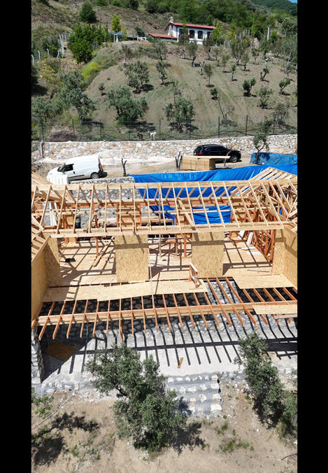 Yapının alt bölümü, yerel dokuyla bütünleşen taş duvar temeli üzerine inşa edildi. Üst strüktürde ise antrasit ve koyu ceviz tonlarının modern ahşap yorumu hâkim. Bu kontrast, doğanın doğal renkleriyle uyum içinde kalırken, projeye güçlü bir estetik karakter kazandırıyor.
